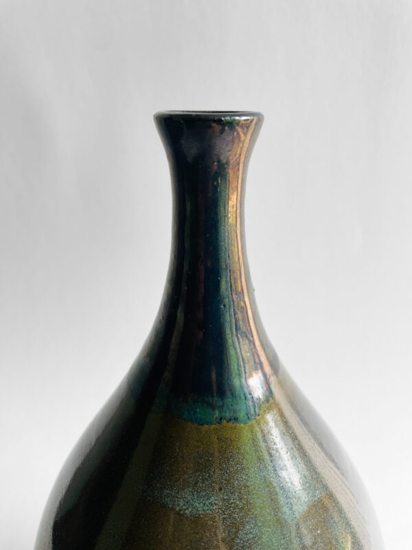 This vase showcases a captivating interplay of color and texture. Its glossy surface