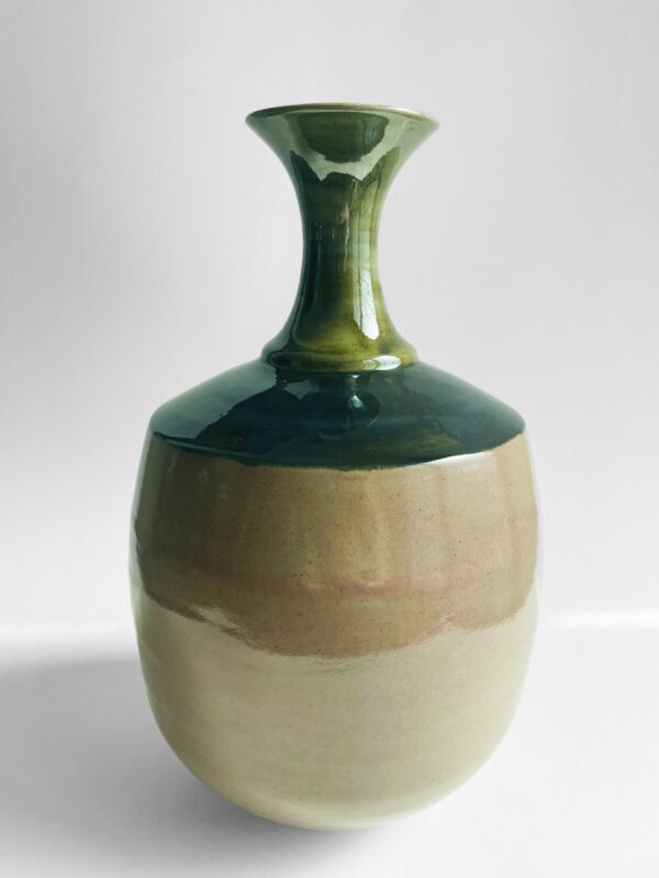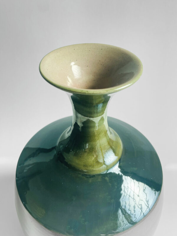 The vase boasts a captivating two-tone color scheme with glossy green tones