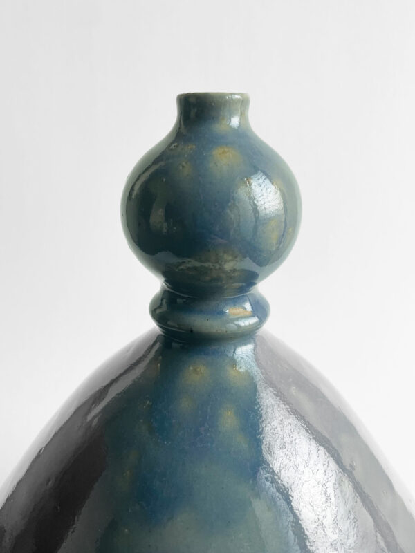 This ceramic vase showcases a striking two-tone design. The upper half is a glossy