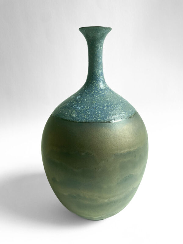 This ceramic vase showcases a unique and striking design, blending a textured grey