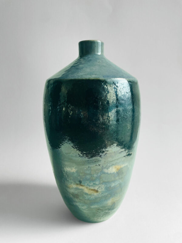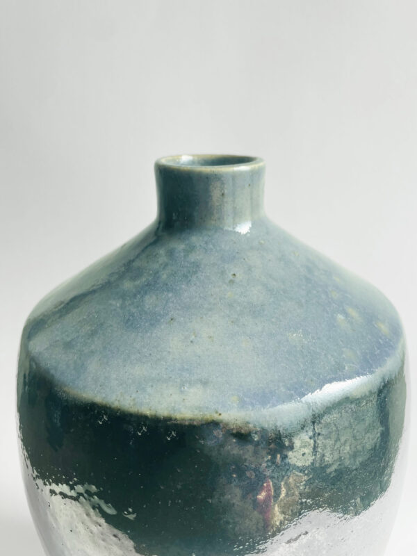 The upper portion of this vase boasts a cool grey-blue hue and a contrasting bluish-